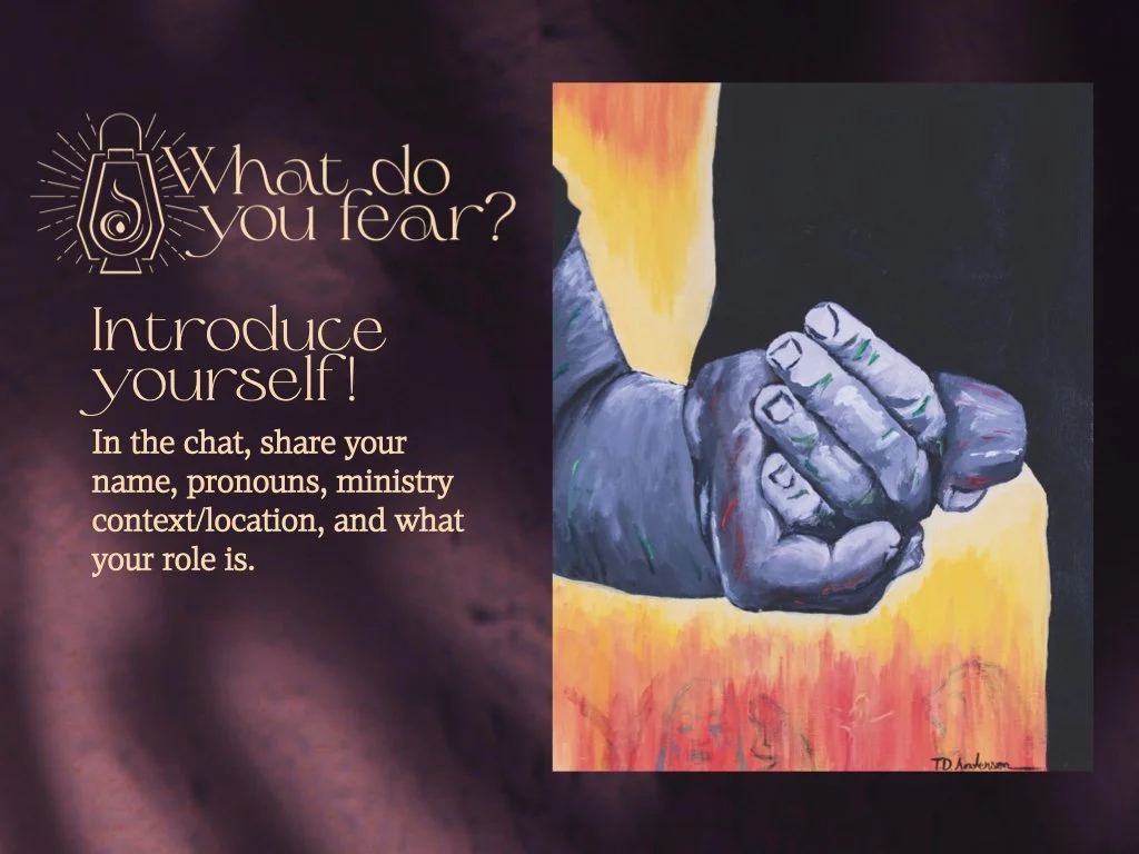 Welcome and introductions from the Sanctified Art creative team alongside participants’ introductions shared in the chat. Introducing all the guest contributors who helped create the What do you fear? resources. An outline of the webinar.