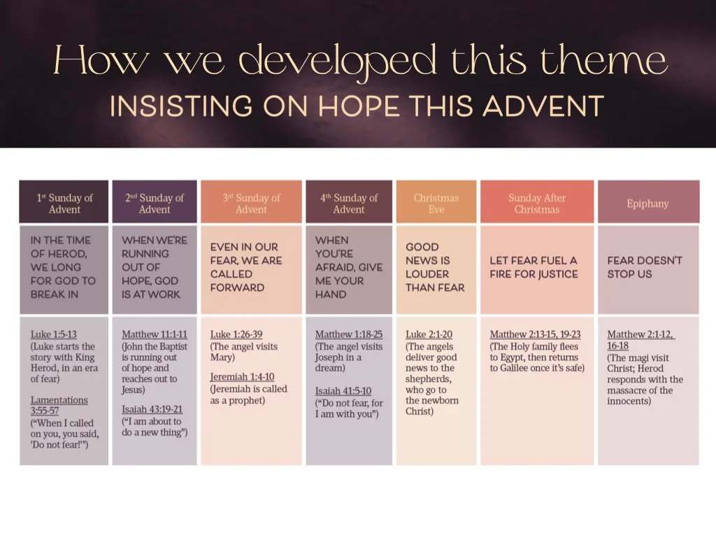 On October 22, 2025, we hosted an Advent Planning Webinar for anyone using (or interesting in using) our Advent series, What do you fear? Insisting on hope this Advent. In this time, we dove into our theme and why we created this series. We shared some tips about how to use the materials, and talked through ideas for implementation. Below is the recording. We hope this can be helpful to you as you plan and prepare.