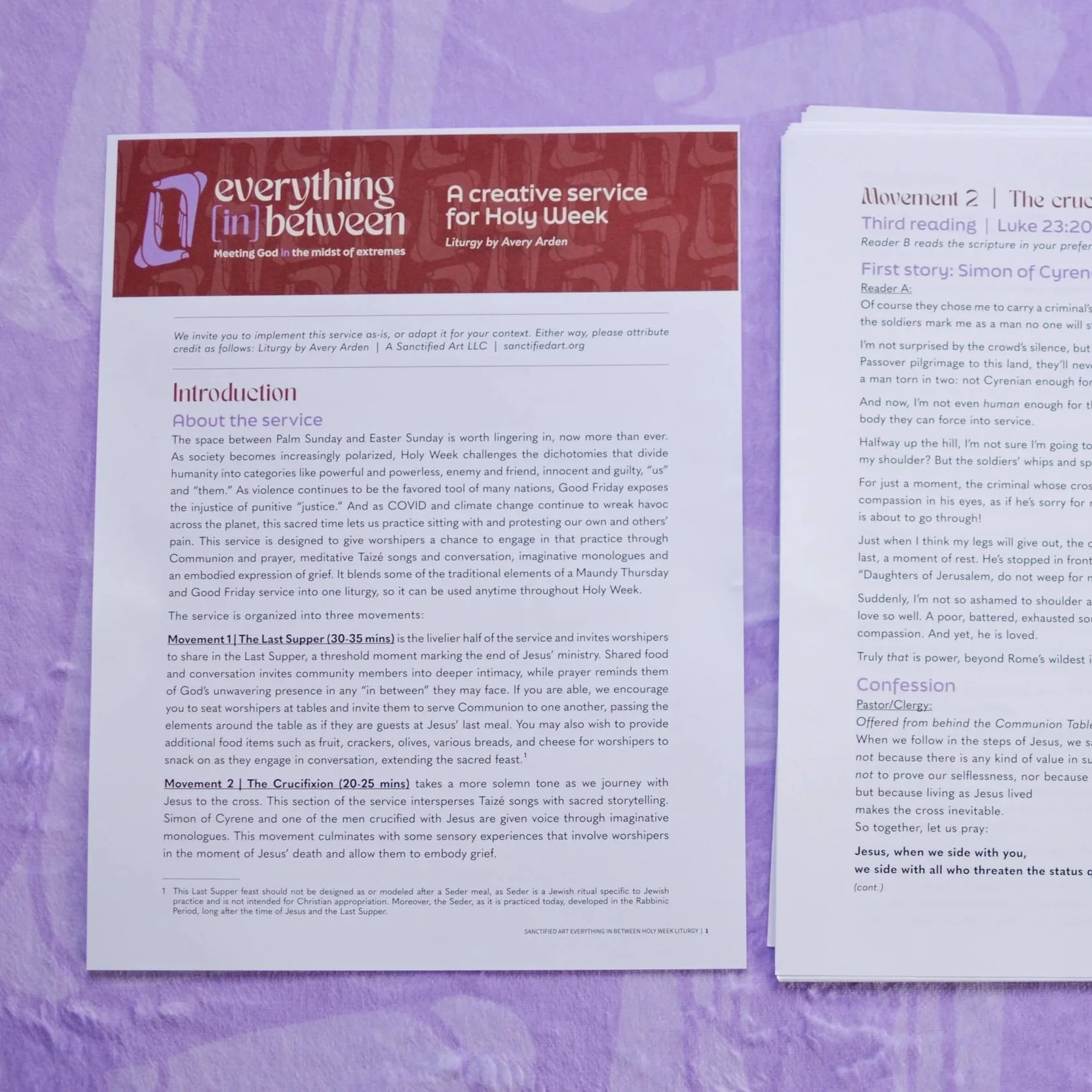 This creative liturgy invites us to sit in the holy in-between of Holy Week with singing, prayer, communion, scripture, imaginative monologues, and silence. With three movements that follow Jesus from the Last Supper to the tomb, this complete worship service could be used at any point during Holy Week. Liturgy by: Avery Arden.