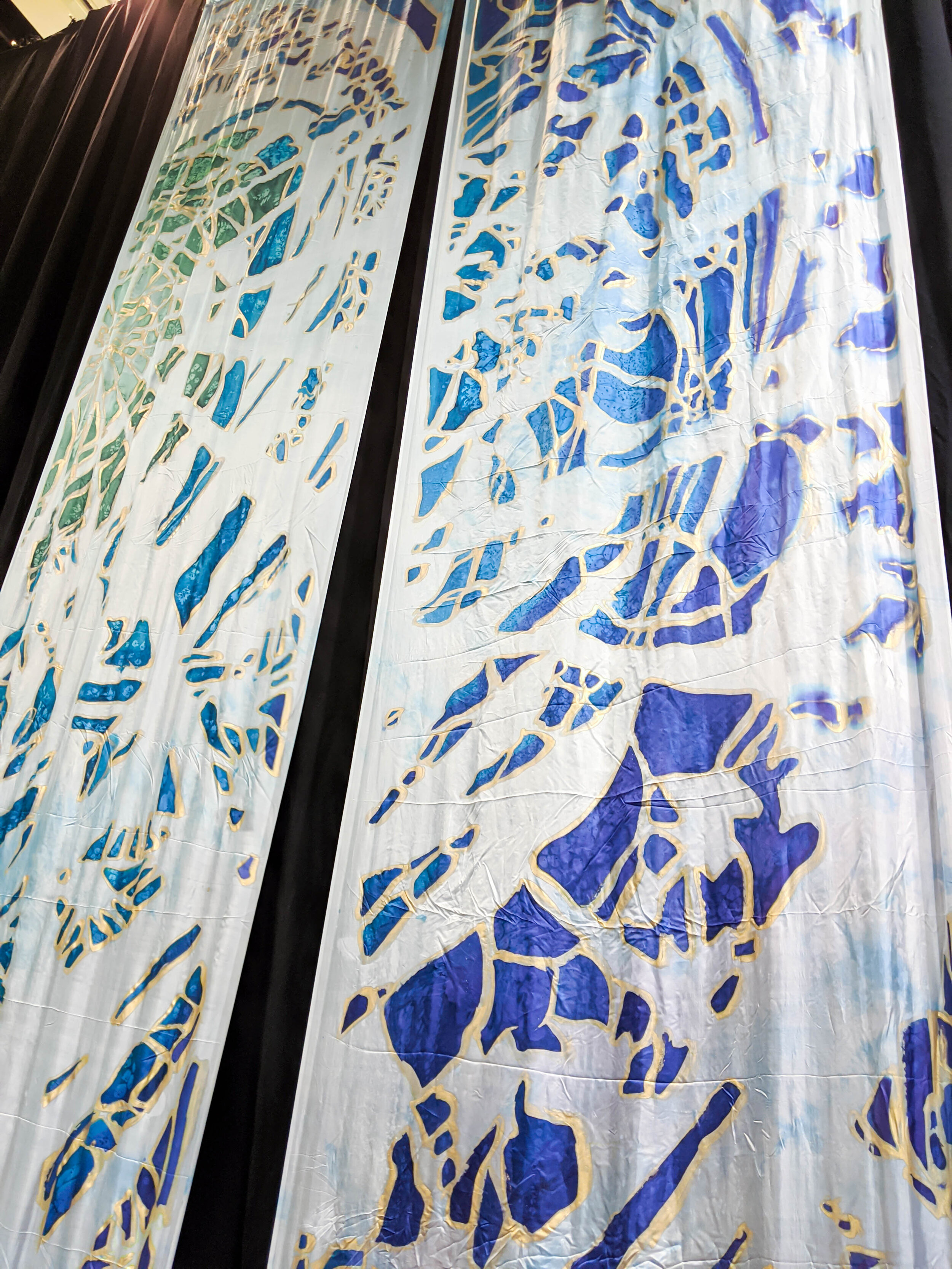 When we arrived in Little Rock, we had one day to prepare for the conference, which included setting the stage (literally!) for worship. Hannah Garrity brought silk banners (20 feet long) she had painted based on our Let There Be Light paper lace banners. The imagery depicts light breaking forth, which beautifully illustrated the “Outside the Box” theme.