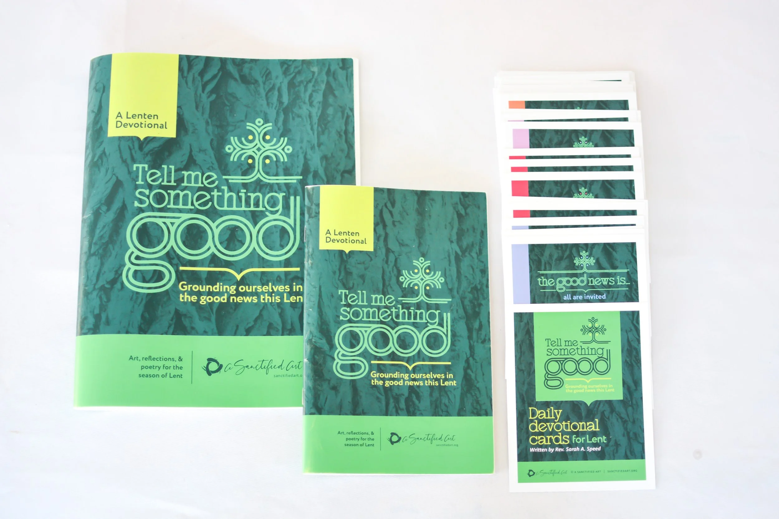 A: This Lent, we are offering the Tell Me Something Good Lent devotional booklet in both standard size (5.5×8.5) and large print (8.5×11). Standard size booklets are $2 each, and large print booklets are $3 each. We are also offering the Tell Me Something Good daily devotional cards for Lent. Daily devotional cards are $3 per set.