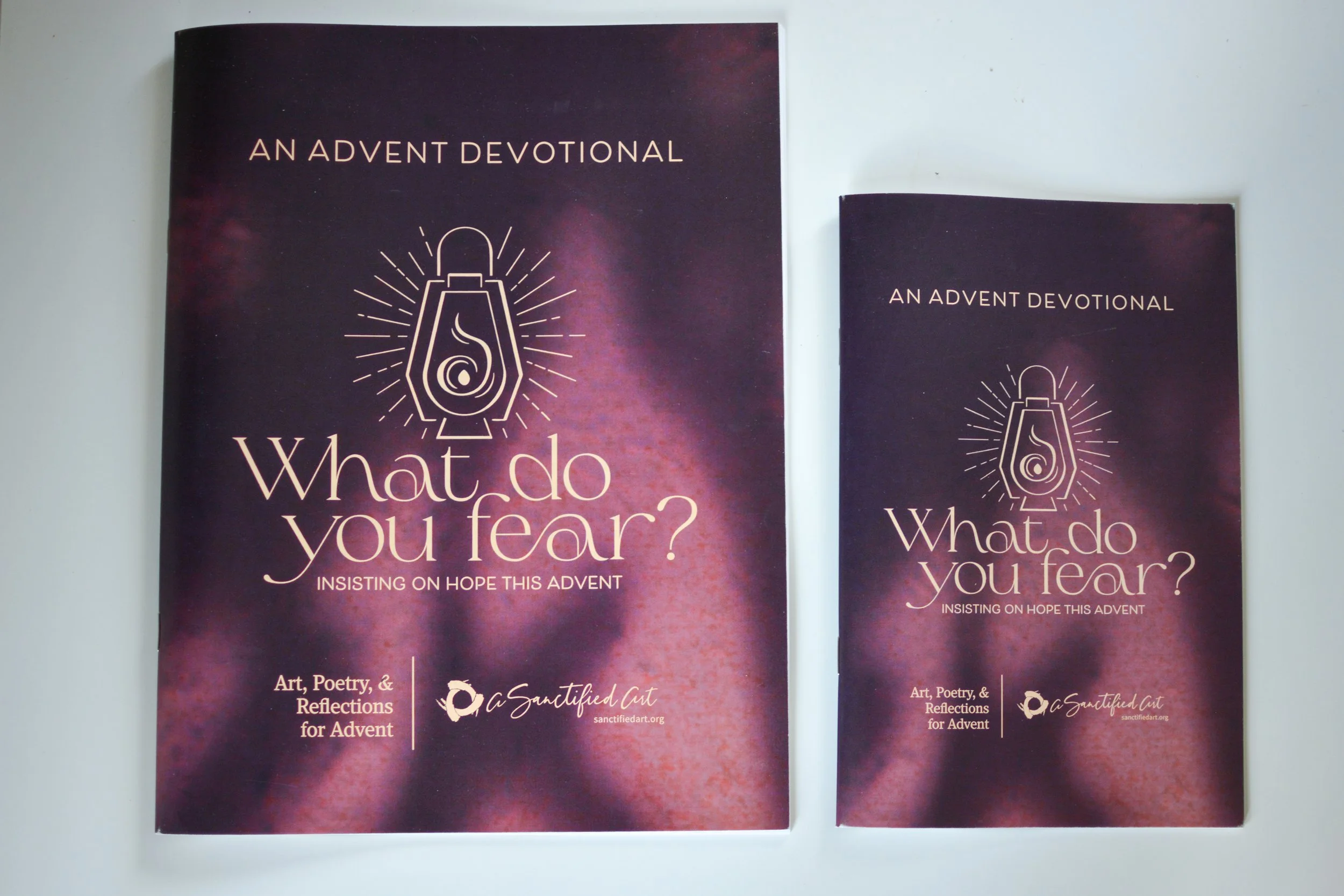 A: This Advent, we are offering the What do you fear? Advent devotional booklet in both standard size (5.5×8.5) and large print (8.5×11). Standard size booklets are $2 each, and large print booklets are $3 each.